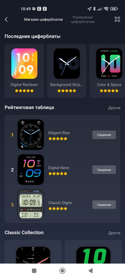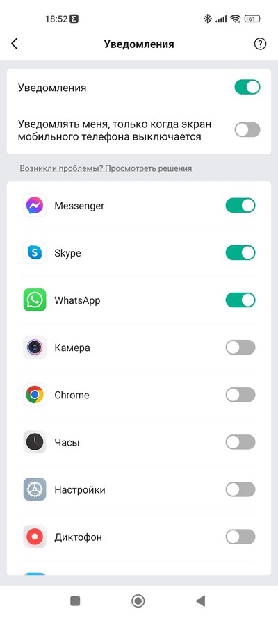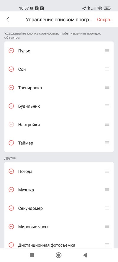Управление списком приложений. Их можно помещать в основной список, в подгруппу "Разное" или скрывать. Также можно указывать, каким приложениям разрешено присылать уведомление в часы. Замечу, что все приложения даются одним списком и там нет ни поиска, ни сортировки, что, конечно, очень непродуманно.