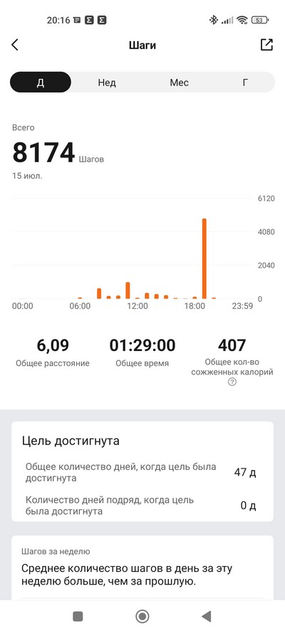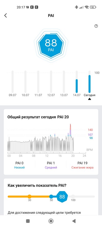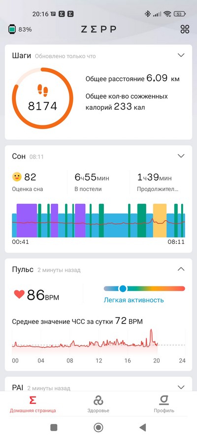 Домашняя страница приложения. Информеры: шаги, сон, пульс, PAI и так далее. Раздел шагов.