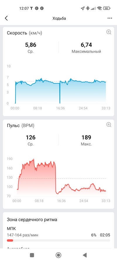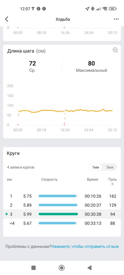 Скандинавская ходьба. Примерно половину маршрута пульс определялся крайне криво (возможно, ремешок был плохо затянут), но потом определять стали правильно.