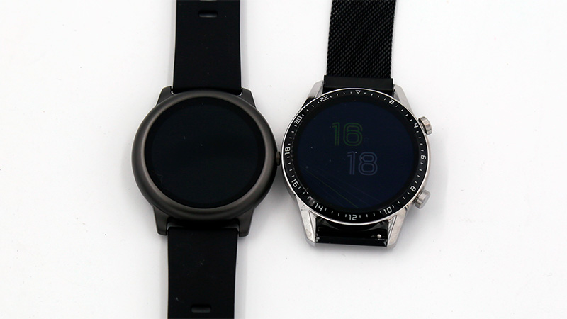 Ну и вот эти часы рядом с моими Huawei Watch GT2 (очень они мне нравятся). У GT2, конечно, внешний вид - намного более эффектный. Но они и стоят в 6-8 раз дороже.
