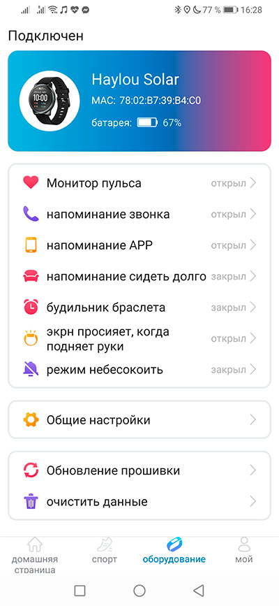 Теперь приложение Haylou Solar. Приложение не как для LS01 (там было Haylou Smart Watch), но с русским интерфейсом здесь те же дикости, что и там. Причем в приложении язык выбрать нельзя, он ставит системный язык. Если весь смартфон переключить, например, на английский, то интерфейс будет вполне пристойный. Русский интерфейс - кошмарный. Но я вам покажу именно его - а чтобы ночью потом снилось.