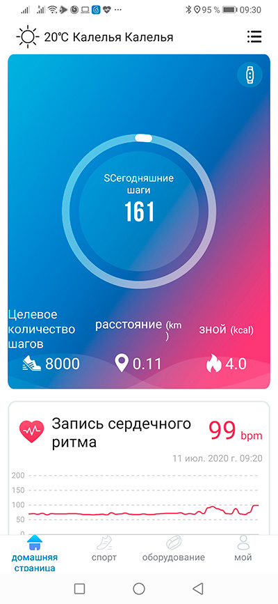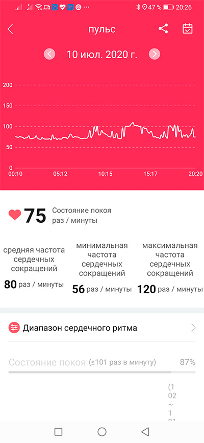 Пульс (с максимальным и минимальным значениями за сегодня). Пульс, кстати, измеряет достаточно точно, я несколько раз сравнивал с тонометром и с медицинским пульсоксиметром (специально его для сравнения покупал).