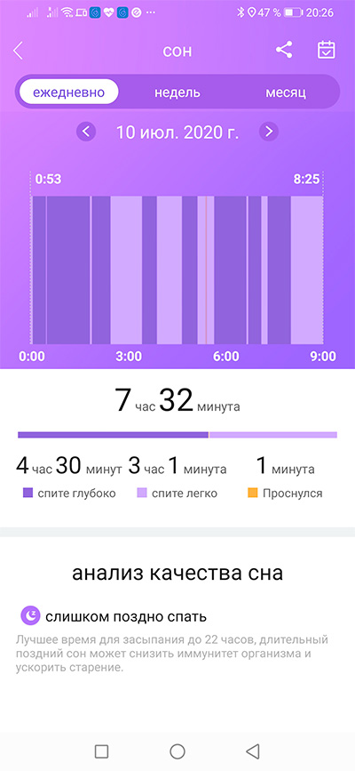 Дневная активность: шаги, километры (интересно, как он их считает - по шагам, что ли?), килокалории.