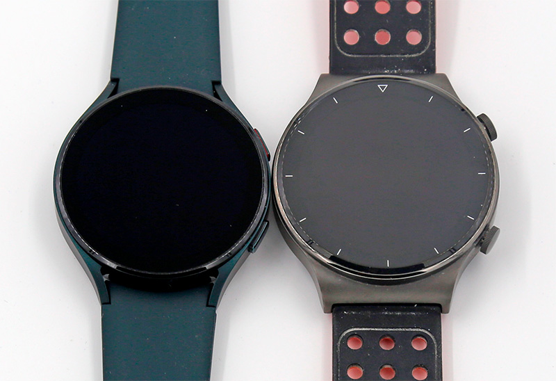 Ну и вот эти часы рядом с Huawei Watch GT 2 Pro: Watch4 немного меньше, выглядят попроще, но смотрятся тем не менее вполне неплохо.
