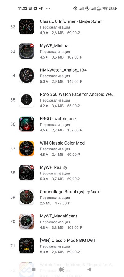 Свайп от циферблата вниз - все установленные приложения. (Их список я покажу в разделе работы с часами в смартфоне.)