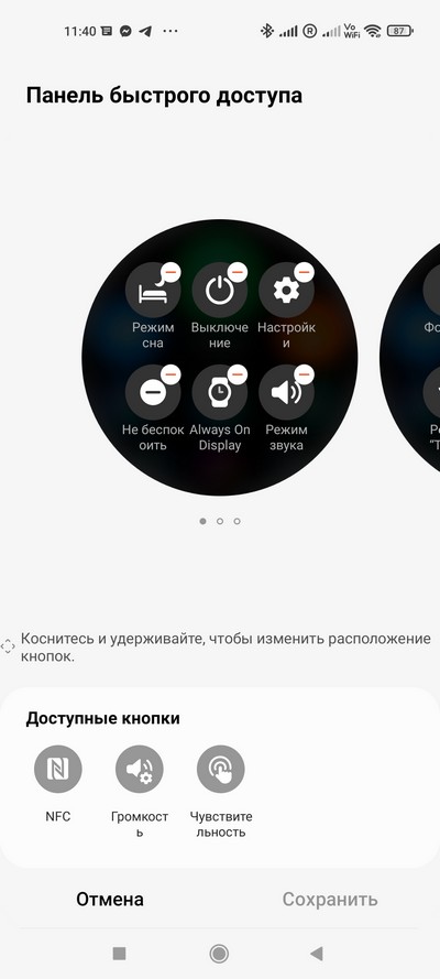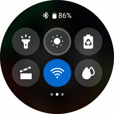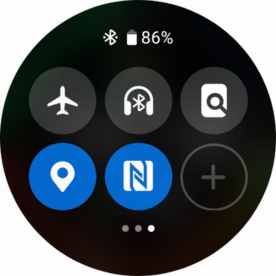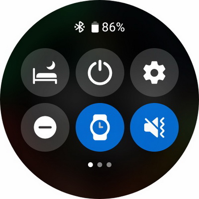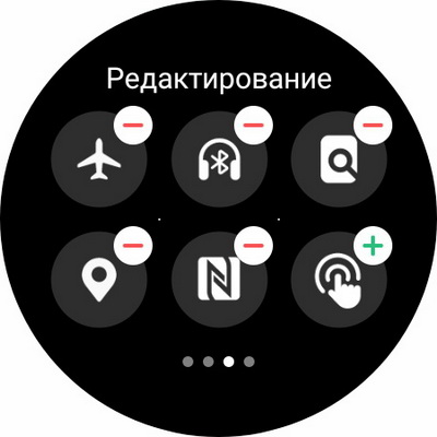 Свайп циферблата вниз - панель быстрого доступа: режим сна, выключение, настройки, отключение любых уведомлений, режим AOD (всегда включенный дисплей: у каждого циферблата - свой вид всегда включенного дисплея), отключение звука/вибрации, фонарик, яркость экрана, включение энергосбережения, режим "в театре", Wi-Fi, очистка от воды после плавания, самолетный режим, подключение наушников, поиск смартфона, включение определения координат, NFC для оплаты, настройка звука. Быстрые переключатели - их количество и порядок следования - можно настраивать.