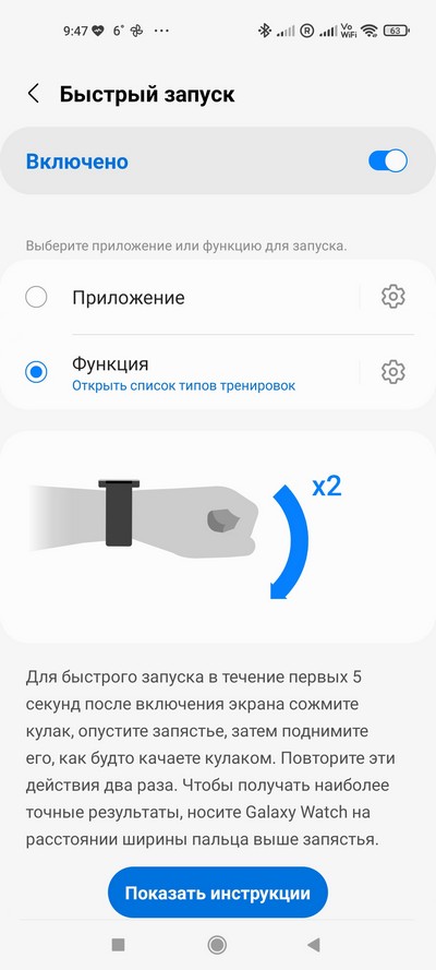 Настройка управляющих кнопок и включение быстрых жестов. Быстрые жесты, кстати, - очень удобная штука. Например, быстрым жестом можно запускать тренировку. И работает это все четко, я проверял.