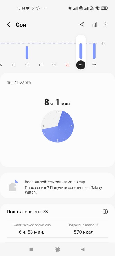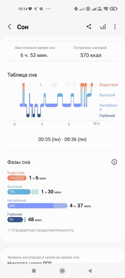 По поводу отслеживания сна. Сон часы определяли достаточно четко, но, по моим ощущениям, явно завышали периоды пробуждения. Также они нередко фиксировали какие-то пробуждения тогда, когда я совершенно точно не просыпался. Ну и часы не всегда определяли продолжение сна: например, проснулся в шесть утра, решил еще поспать, минут через десять заснул, а часы определили, что я в шесть уже встал, и следующий отрезок сна не засчитали.