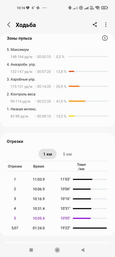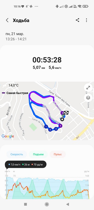 С тренировками тут отслеживание примерно так же, как и у предыдущих Samsung Galaxy Watch 3. В сравнении с Garmin Venu 2 занижали общее расстояние (метров 200 для 5,35 км - многовато), пульс фиксировали явно хуже - в какие-то моменты пульс заметно завышали.