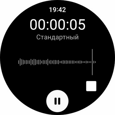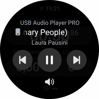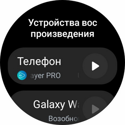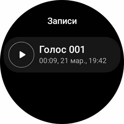 Также есть два экрана, появляющихся при свайпе влево/вправо. Свайп влево - аудиоплеер. Он может управлять плеером смартфона, может воспроизводить аудио из памяти часов (там доступно порядка 7,5 ГБ). К часам можно подключить беспроводные наушники, и тогда аудио будет воспроизводиться через них.
