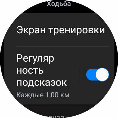 У тренировки есть три вертикальных экрана с различными данными (для ходьбы - длительность, расстояние, шаги, калории, средняя скорость, текущая скорость, зоны пульса).