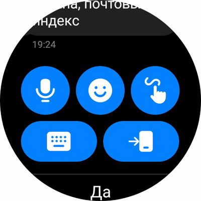 Варианты ответа: голосовое сообщение, смайлики, рисование текста ответа (часы будут распознавать и переводить в текст), набор текста на клавиатуре, ответ предустановленным сообщением.