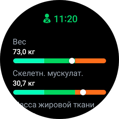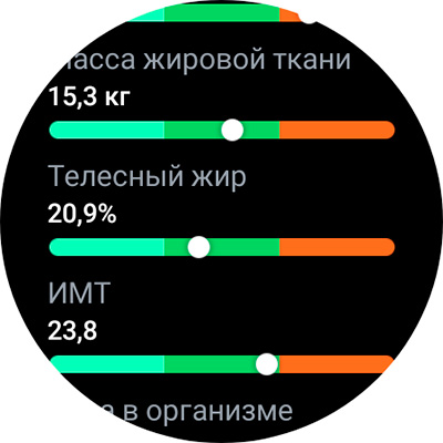 Любопытная возможность - измерение параметров организма биоимпедансным методом. (Как в умных весах.) Для этого нужно приложить два пальца другой руки к управляющим кнопкам и запустить измерение.