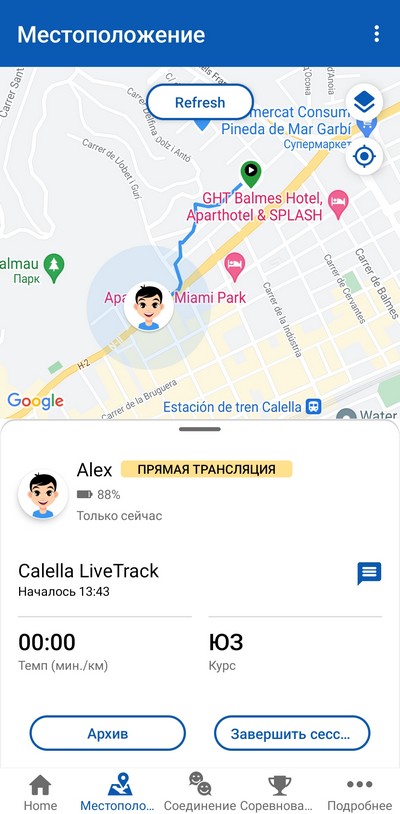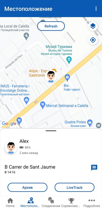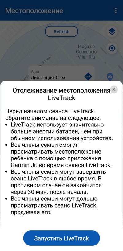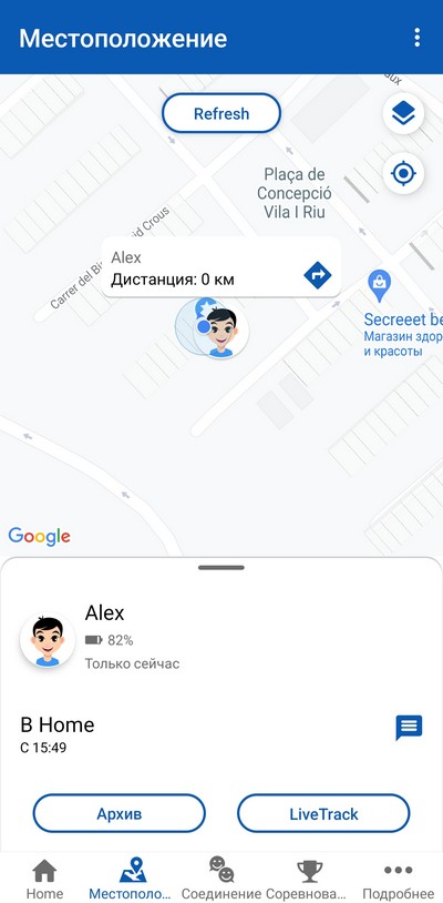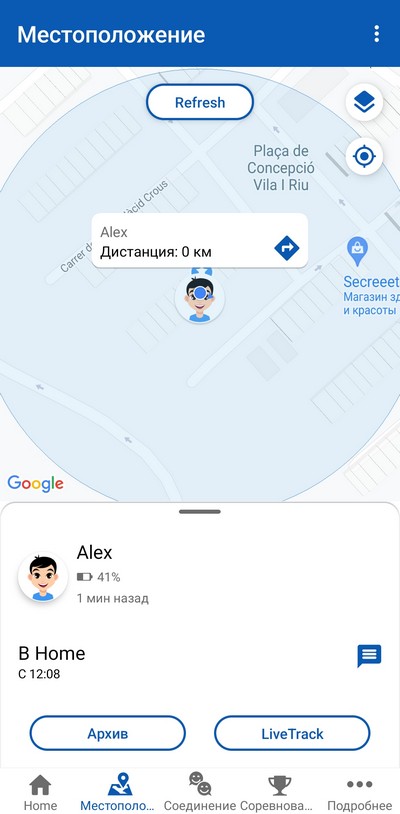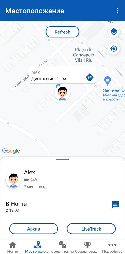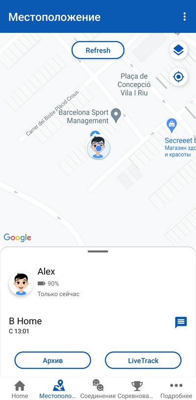 А вот ребенок отправился к другу в гости, включен LiveTrack и приложение отслеживает его маршрут. Потом постоянный трекинг отключается, и его местоположение выдается по запросу.