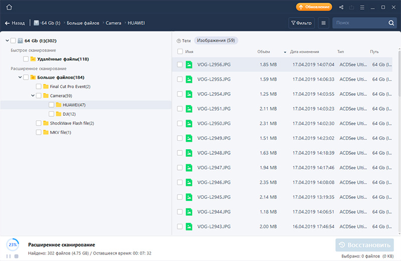 Выбрал для восстановления фотографии из папки HUAWEI, которые были записаны на эту флешку почти год назад.