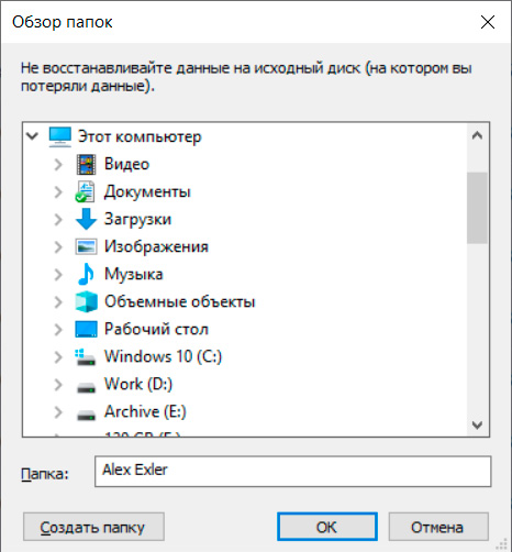 Отметим их все, попробуем восстановить. Программа предложит выбрать другой накопитель для восстановления, чтобы не затирать восстановленными файлами информацию на данном диске.
