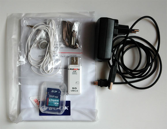 Комплектация у V3 следующая: чехол; SD-карта на 512 мегабайт (в формате FB2 туда можно запихнуть минимум тысячу книг, а вообще-то полторы-две тысячи); USB-ридер для SD-карты; наушники; петелька для ношения ридера на руке; адаптер питания, совмещенный с проводом USB-miniUSB. На мой взгляд, это все, что нужно.
