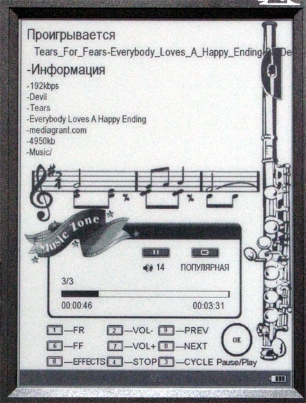Встроенный MP3-плеер работает вполне пристойно. Аудиофайлы копируются в папки точно так же, как и книги, ридер их сам распознает и при попытке открыть начинает воспроизводить, при этом в обязательном порядке требуя вставить наушник - без этого не воспроизводит.