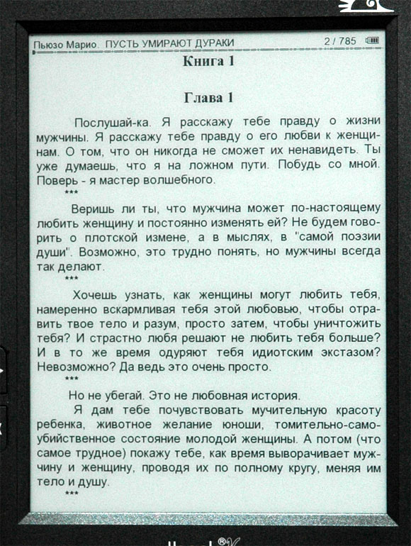 С поддержкой FB2, конечно, закачивать новые книги стало на порядок удобнее. Во-первых, пропала необходимость производить конвертирование скачанных книг в соответствующий формат - например, WOLF. Во-вторых, FB2, в отличие от WOLF, который приходилось использовать в V8, отличается значительно меньшими размерами. Для сравнения, книга Дмитрия Липскерова "Последний сон разума" в формате FB2 занимает 665 килобайт, то есть чуть больше половины мегабайта, а в формате WOLF - 16 мегабайт, то есть в 32 раза больше!