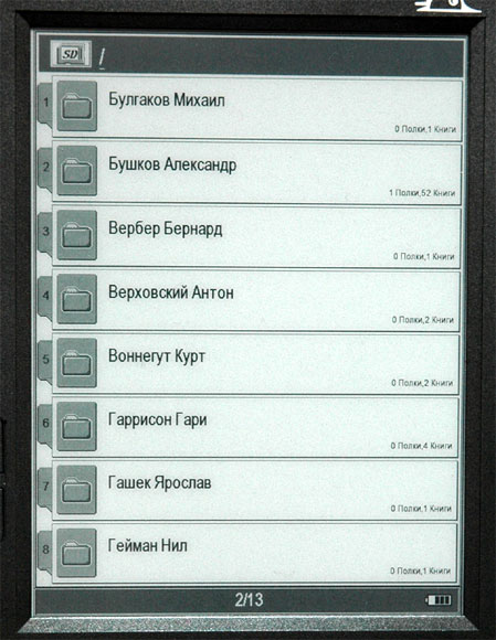 Так что теперь, чтобы загнать в ридер библиотеку, нужно просто разбить книги в формате FB2 (или любом другом из поддерживаемых) по папкам с фамилиями авторов, а потом переписать всю структуру на флешку - комплект готов.
