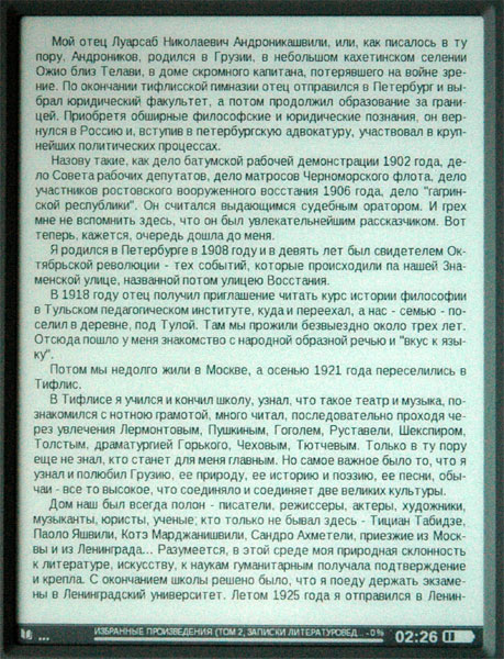 ОЧЕНЬ довольна.Все, кому показывала, в полном восторге. 2 недели назад зарядила, за это время прочитала около 2 тысяч страниц- ушло всего одно деление. Аппарат очень удобный, интуитивно понятный- ни разу не заглянула в мануал. Шрифты на выбор, кнопок не много и все очень логичные. Легкий, компактный. А память 512+карта на 1 гиг....Глаза не устают совершенно. Спасибо, Алекс, большое!