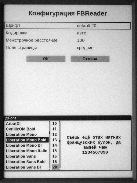 Настроек следует коснуться особо - там вы можете выбирать гарнитуру и кегль шрифта, задавать расстояние между строками и поля.