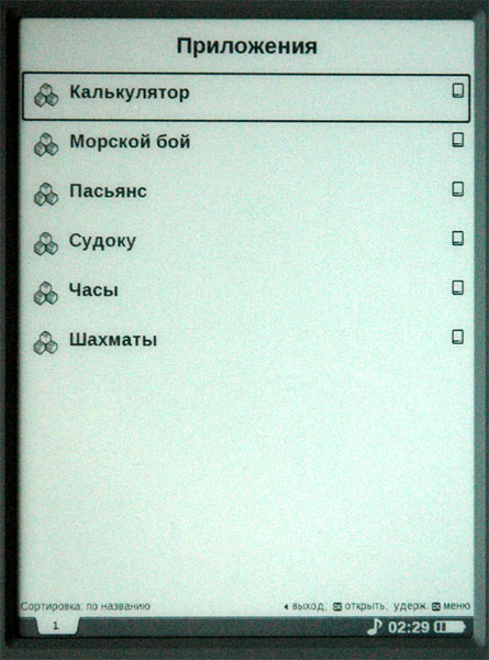 Главное в букридере - чтение книг. При заходе в раздел "Книги" вам выдается список представленных во внутренней памяти и на SD-карточке произведений.