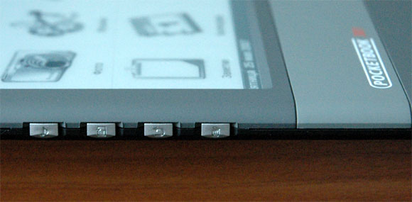 На левом торце - четыре кнопки: корзина (она же добавление заметки в блокнот при просмотре текста), возврат, главное меню, вызов аудиоплеера.