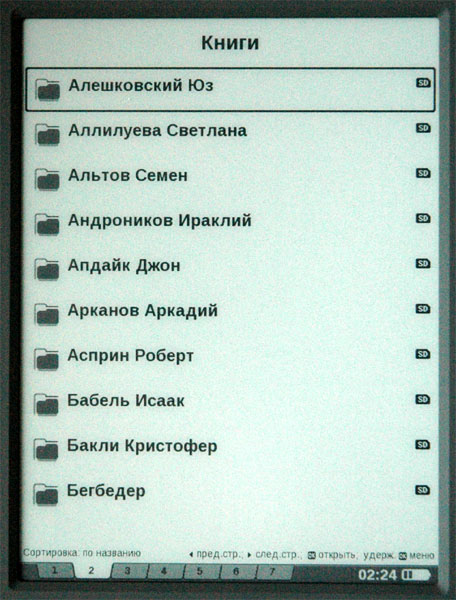 По умолчанию идет сортировка по названию. Страницы можно листать джойстиком. Папки (обычно одна папка - один автор) открываются кнопкой ОК, но если ее нажать и удерживать - появляется меню, в котором можно выбрать вид представления книг (список, эскизы, подробная информация), вид сортировки (по названию, по автору, по именам файлов), а также, что уж совсем экзотика, можно вызвать поиск книги по автору или названию.
