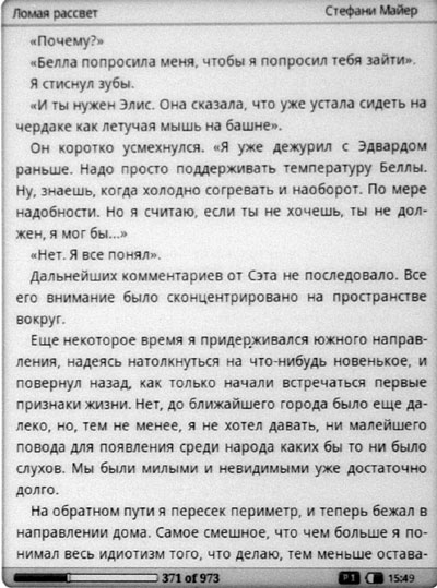 Открываем выбранную книгу. На верхнем дисплее появляется текст, который можно читать, листая страницы - как на обычном ридере. Производители устройства нигде не пишут, какой именно дисплей E-Ink они устанавливают, но, судя по всему, тут используется обычный VizPlex третьего поколения, который на данный момент считается уже слегка устаревшим (после выхода Sony PRS-350, PRS-650, PRS-950 и Amazon Kindle 3 и Kindle DX).