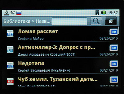 Список книг выводится в очень удобной форме: видны формат, название, автор, дата закачки и местонахождение (SD или внутренняя память)