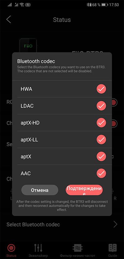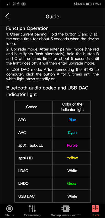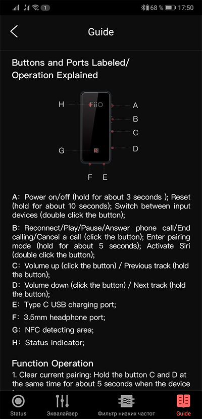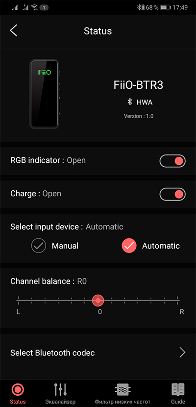 Приложение Fiio Music определяет подключение данного усилителя, позволяет делать какие-то настройки, выбирать кодеки, также дает подсказки по управлению и цветовым сигналам индикатора.
