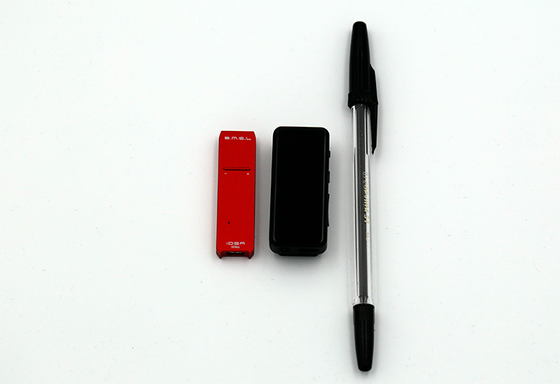 Прежде всего покажу, насколько это устройство совсем небольшое - размером с толстенькую флешку. А то я и сам, когда его заказывал, по размеру представлял себе что-то вроде плеера Fiio X3iii. Нет, устройство реально маленькое: вот оно рядом с усилителем SMSL Idea и ручкой для сравнения масштабов.