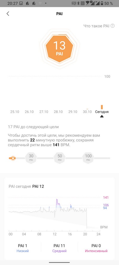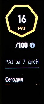 Главное окно приложения, раздел с индексом PAI. (Индекс физической активности, рассчитываемый по нескольким параметрам, куда входит прежде всего пульс.)