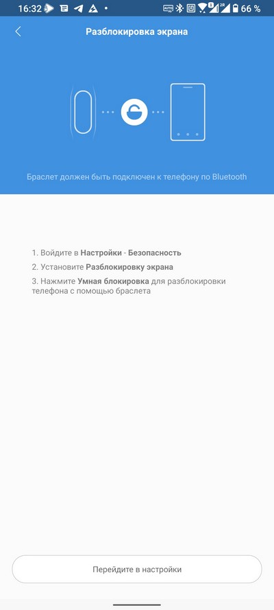 Главное окно Band 5 и настройка разблокировки экрана браслетом.