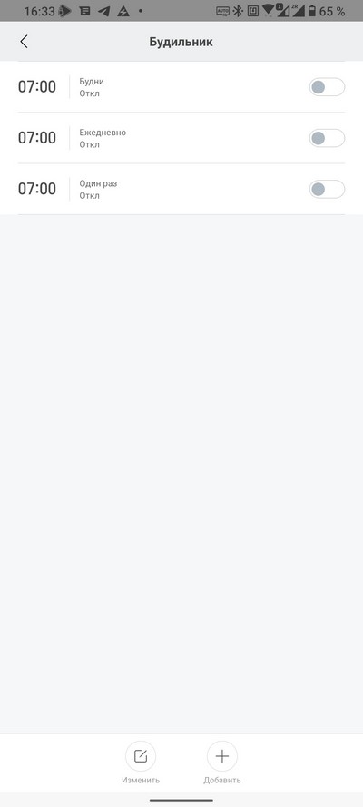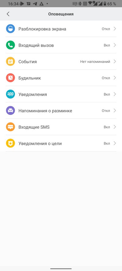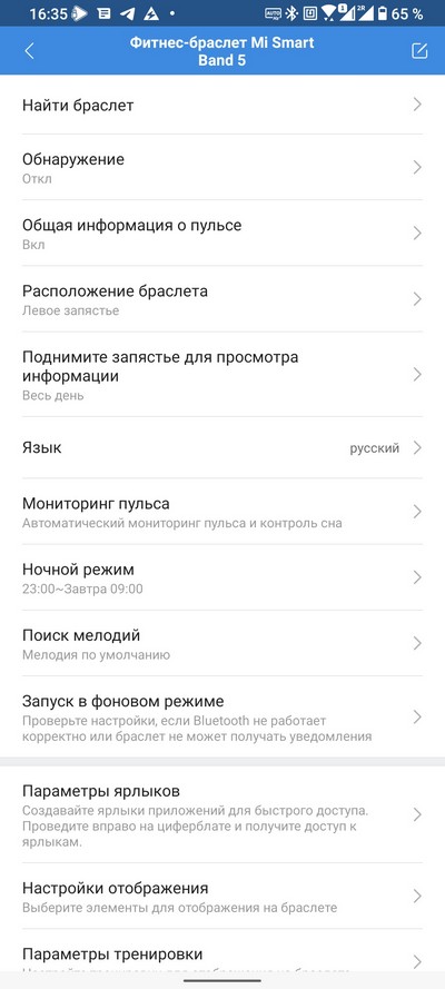 В разделе "Дополнительно" - текстовые ссылки (они могут быть достаточно длинные, в этом случае они автоматически проплывают справа налево): не беспокоить (именно здесь задается диапазон молчания браслета), будильник, камера, музыка, секундомер, таймер, найти устройство (в смысле, найти смартфон, причем смартфон реально начинает издавать очень и очень громкий и мерзкий звук), без звука, мировые часы, дисплей (настройки дисплея) и общие настройки.