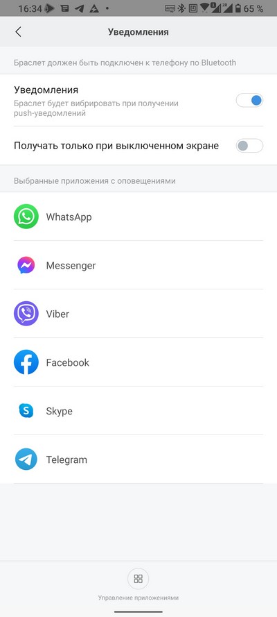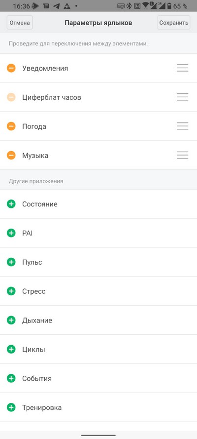 Настройки ярлыков браслета (приложений, которые будут появляться по свайпу влево-право на экране браслета).