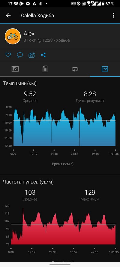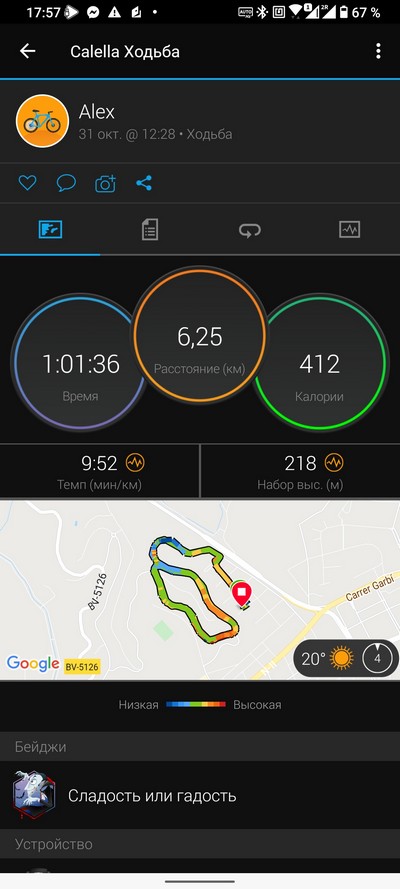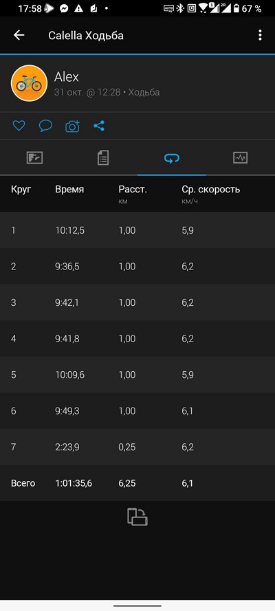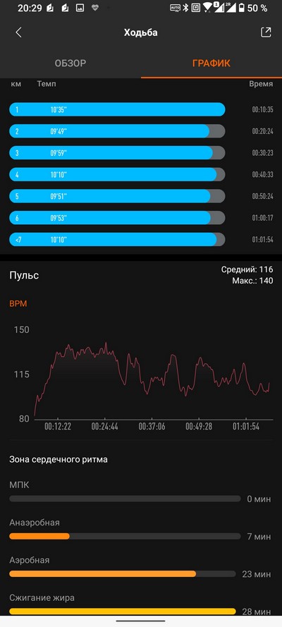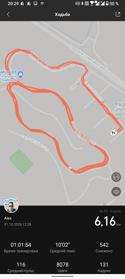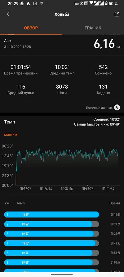 Впрочем, был момент, когда на первой тестовой тренировке на хорошо промеренном маршруте браслет завысил дистанцию в 6,2 километра аж где-то на 400 метров, что многовато (я для теста сверял с часами Garmin), но там он и сам маршрут построил как-то криво. Однако второй, третий и четвертый раз он этот маршрут измерял вполне корректно. С Garmin некоторые расхождения были, но вполне в пределах погрешности (выше все скриншоты приведены).