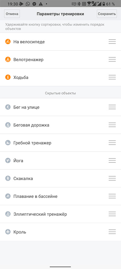 Измерение шагов и настройка видов тренировок, которые будет показывать браслет.