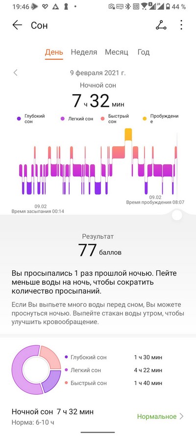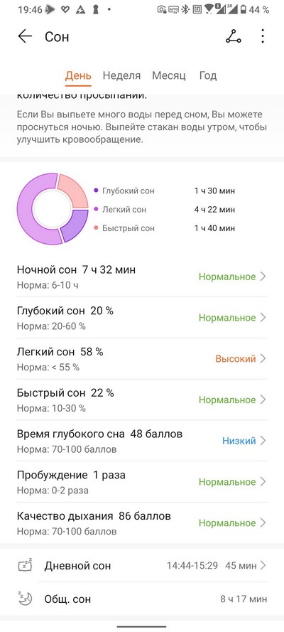 Журнал сна и подробная информация о сегодняшнем сне. Обратите внимание на то, что часы зарегистрировали и недолгое пробуждение, и дневной сон.