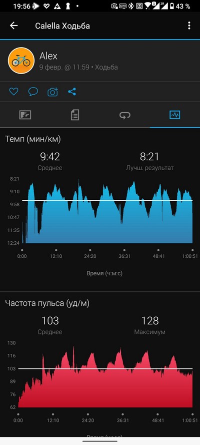 Средний темп и пульс. С пульсом они слегка налажали, пульс все-таки где-то до 130 поднимается (Garmin это зафиксировал).