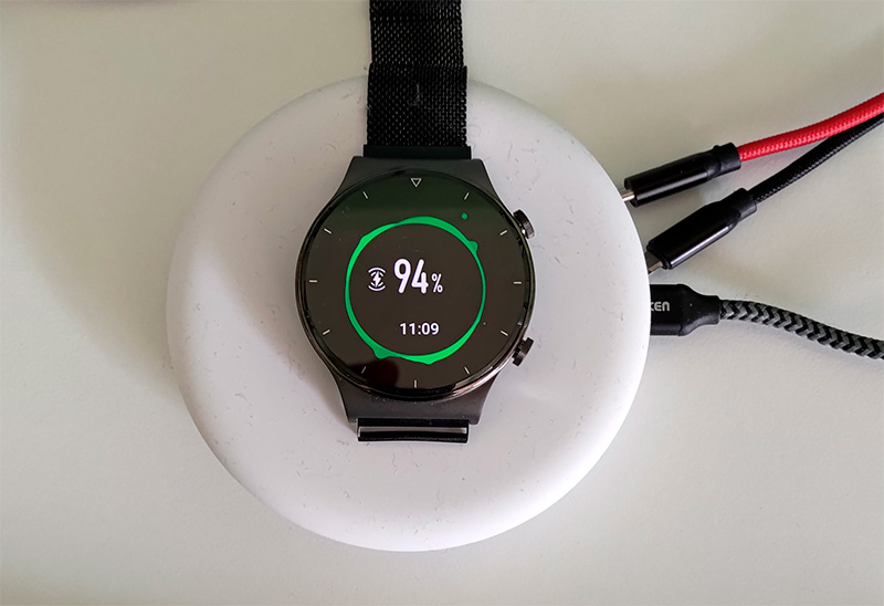 По характеристикам эти часы похожи на Huawei Watch GT 2, что неудивительно. Однако здесь есть одно очень существенное улучшение: данные часы поддерживают беспроводную зарядку, причем, вообще говоря, любую. Заряжаются они по беспроводной зарядке мощностью 10 ватт.