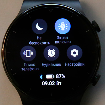 Свайп основного циферблата вниз - область быстрых переключателей и информации. Тут показываются уровень заряда батареи, статус подключения к телефону, дата и день недели. Также тут пять пиктограмм: "Не беспокоить", режим постоянно включенного экрана, поиск смартфона, будильник и настройки.