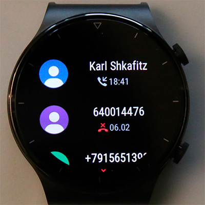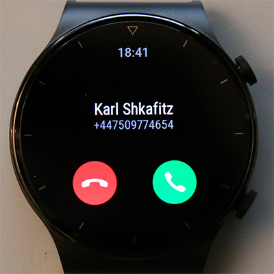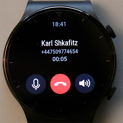 Входящий звонок. Если его принять здесь, то разговор будет вестись через микрофон и динамик часов - в некоторых случаях это удобно (например, в машине, когда смартфон не подключен к громкой связи). Качество звука - хорошее, я несколько раз проверил: и голос в динамике звучит достаточно громко, и мой голос абоненты слышали хорошо. При разговоре со смартфона можно отключать микрофон и динамик. Передавать разговор на подключенные по Bluetooth наушники эти часы не умеют. Также они не позволяют отвечать на аудиовызовы из мессенджеров (только сообщение выдают о том, что есть входящий звонок в таком-то приложении).