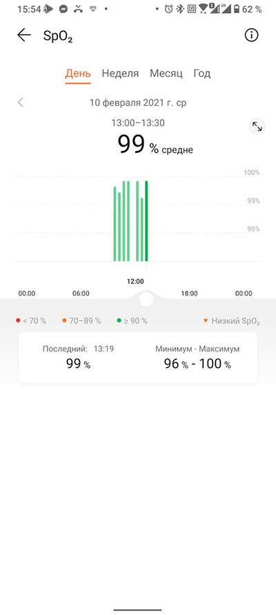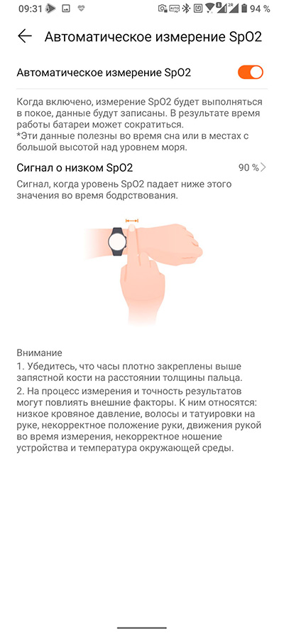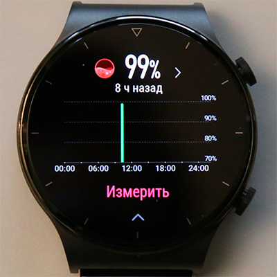 Уровень оксигенации крови (насыщенность кислородом). Вообще, мне в очередном обновлении сообщили, что эти часы теперь могут измерять оксигенацию постоянно, так же как и пульс. Однако в настройках эта опция пока не появилась, хотя я видел скриншоты, где эта опция уже есть, - возможно, это зависит от страны. (Есть способ включить данную опцию, о ней - ниже.)