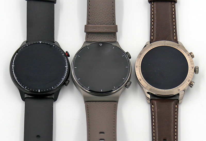 Ну и вот эти часы (в центре) рядом с классными Amazfit GTR 2 (слева) и люксовыми Zepp Z, которые, по сути, те же Amazfit GTR 2, только в более богатом корпусе из титанового сплава.