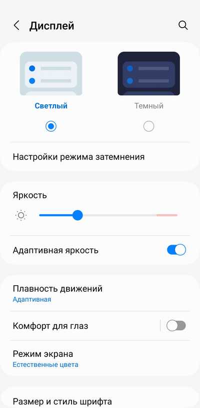 В настройках дисплея есть много всего. Темная и светлая темы, можно менять размер шрифта и масштаб объектов.