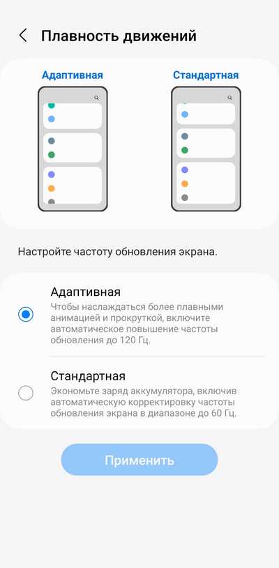 Настройка частоты обновлений (прямо 120 Гц выставить нельзя, можно выставить стандартные 60 Гц или адаптивную частоту, чтобы смартфон сам выставлял повышенную частоту, когда считает нужным).