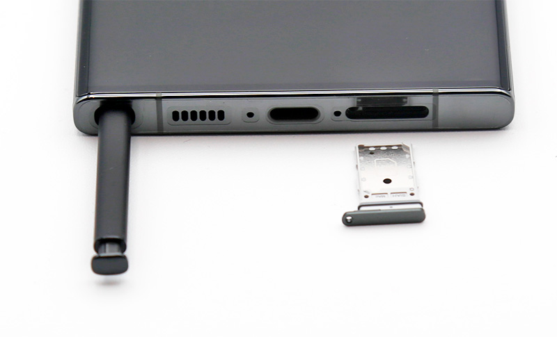 Нижняя грань: утопленный в соответствующем слоте стилус, который при нажатии выдвигается из слота, прорези над стереодинамиком, микрофон, порт Type-C, слот под вставку с симкартами.