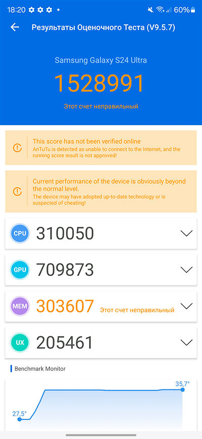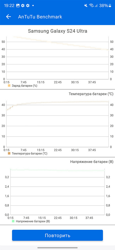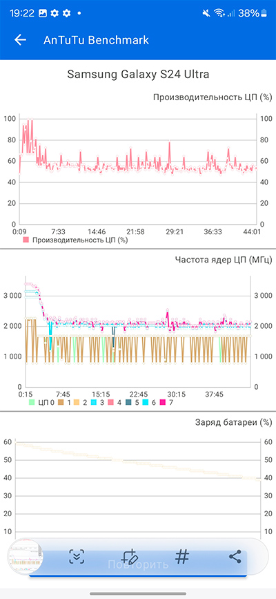 Стресс-тест AnTuTu. Температура поднялась до 43 градусов - нормально.